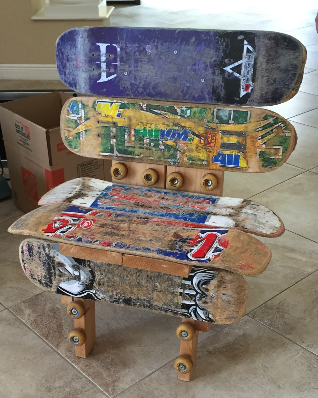 Skateboard Chair: Transforming the everyday into extraordinary, our skateboard chair is a fun way to remember all those banged up shins by making a throne of there remains. This chair has old trucks with wheels mounted on it also so it can roll from the garage down to the street.